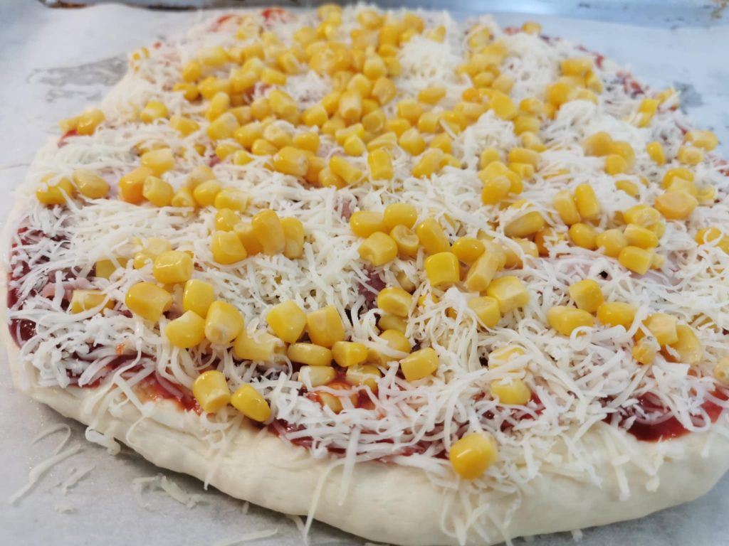 Megkenhetjük ketchuppal, sonkaszeleteket teszünk rá, megszórhatjuk baconkockákkal, nagy adag reszelt sajttal és kukoricával.