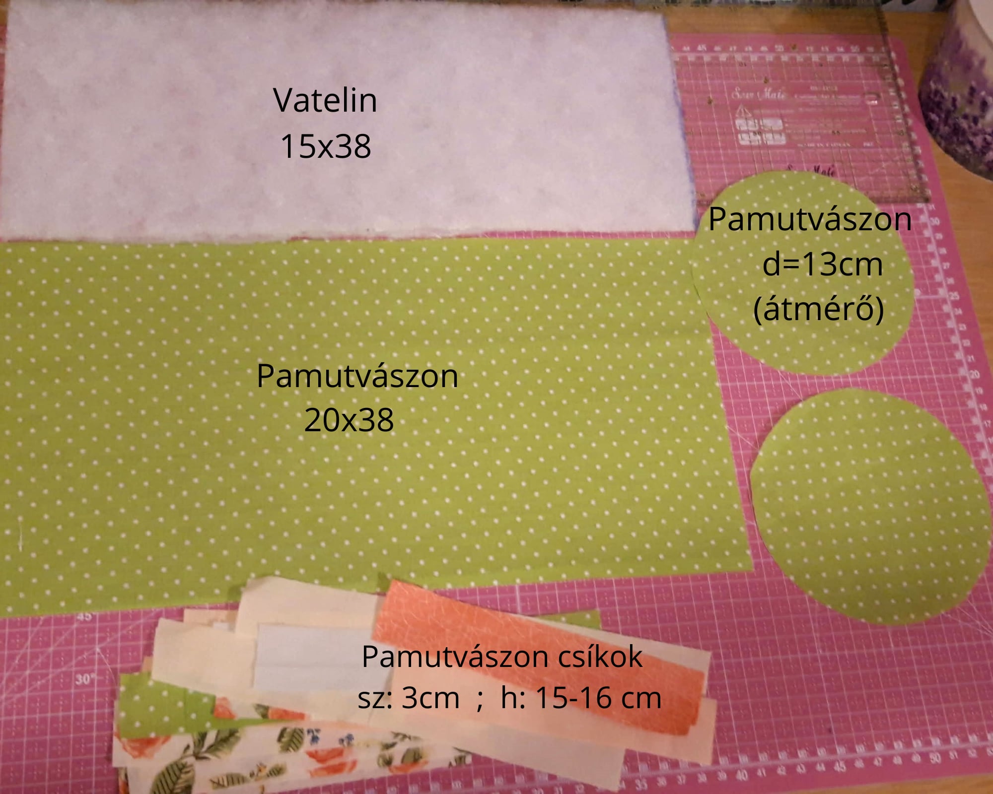 Kiszabtam a képen látható méreteket. A képről lemaradt, de vatelinből is szabtam egy 13 cm átmérőjű kört. A csíkokból kb 20 db-ot használtam. De lehet 3cm-nél szélesebb csíkokból is készíteni.