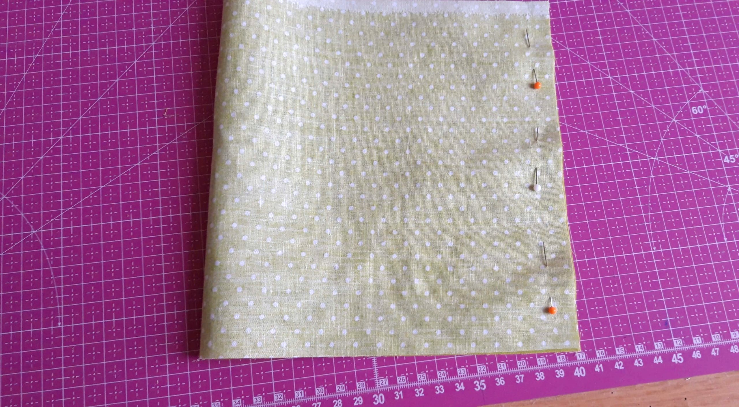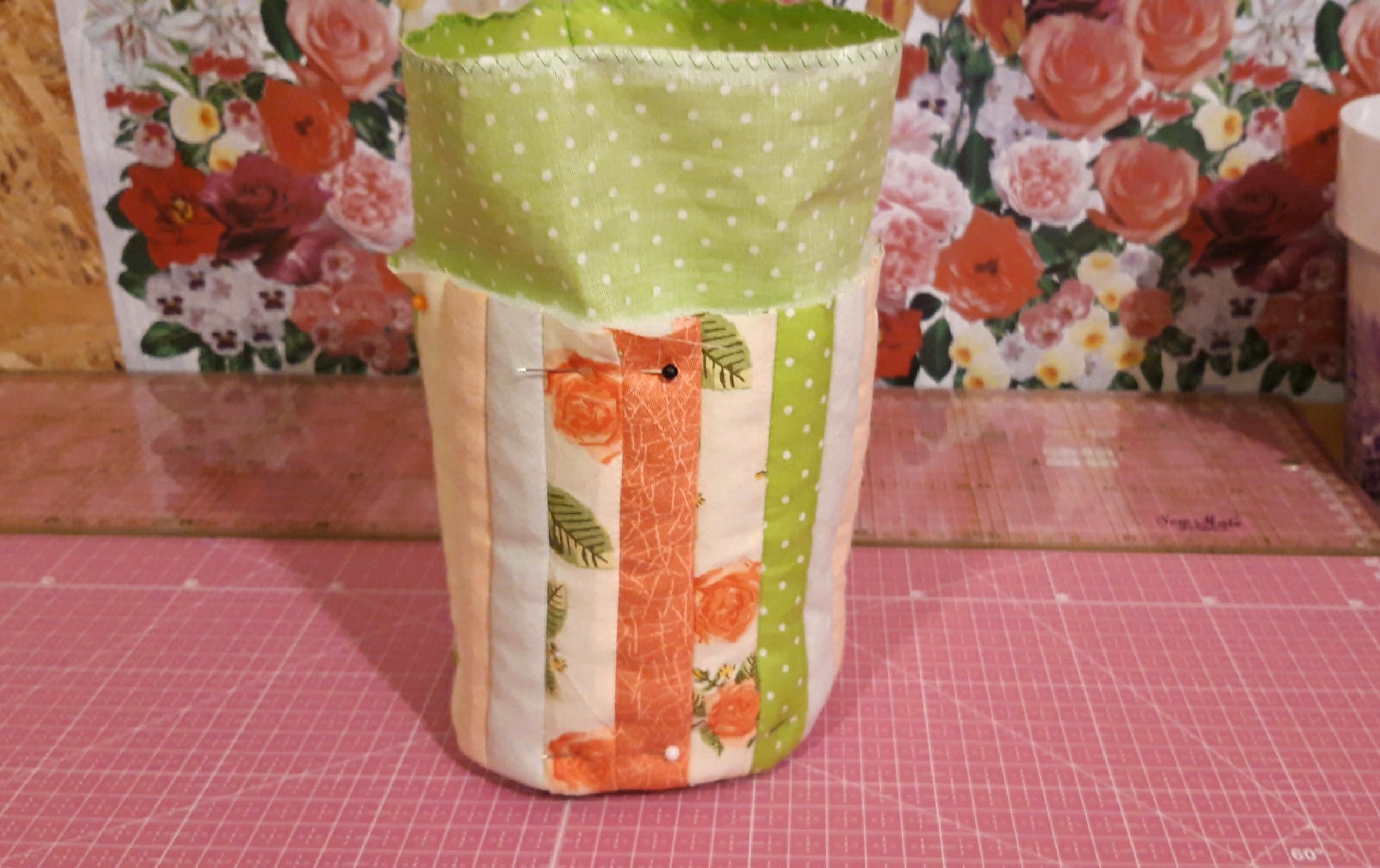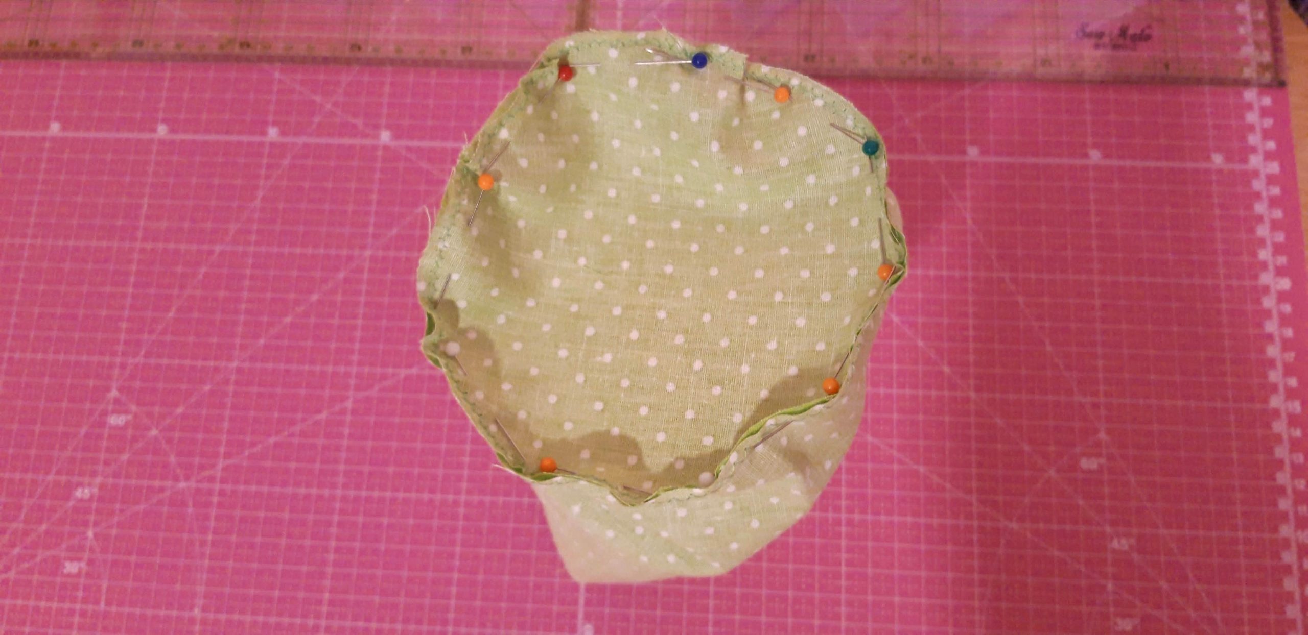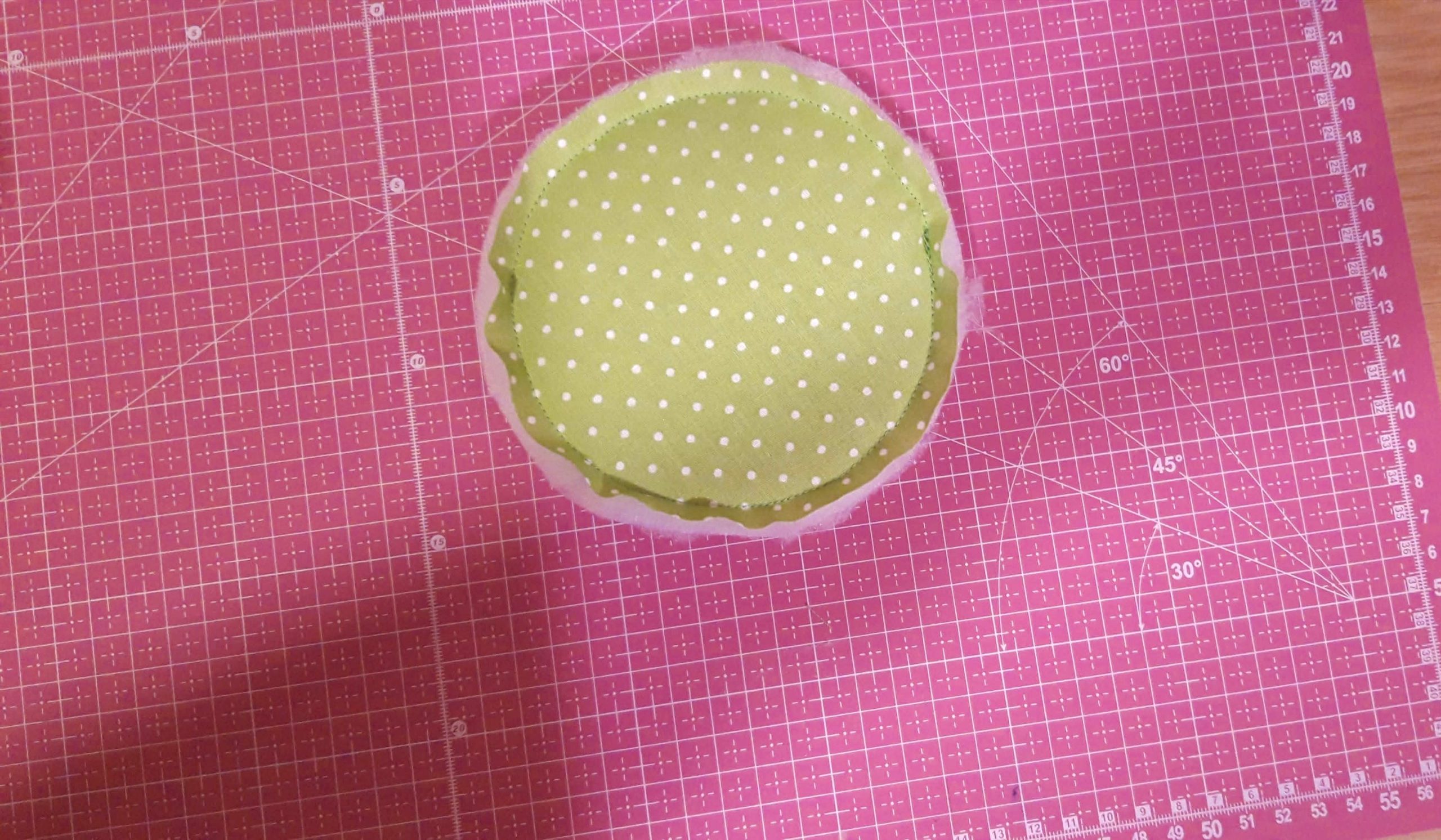 A belsejéhez a nagyobb pamutvásznat színével befelé félbehajtottam és a szélét a gombostűzésnél összevarrtam. Ebből is lett egy henger, aminek az aljára a másik kör alakú pamutvásznat színével befelé rátűztem és rávarrtam.