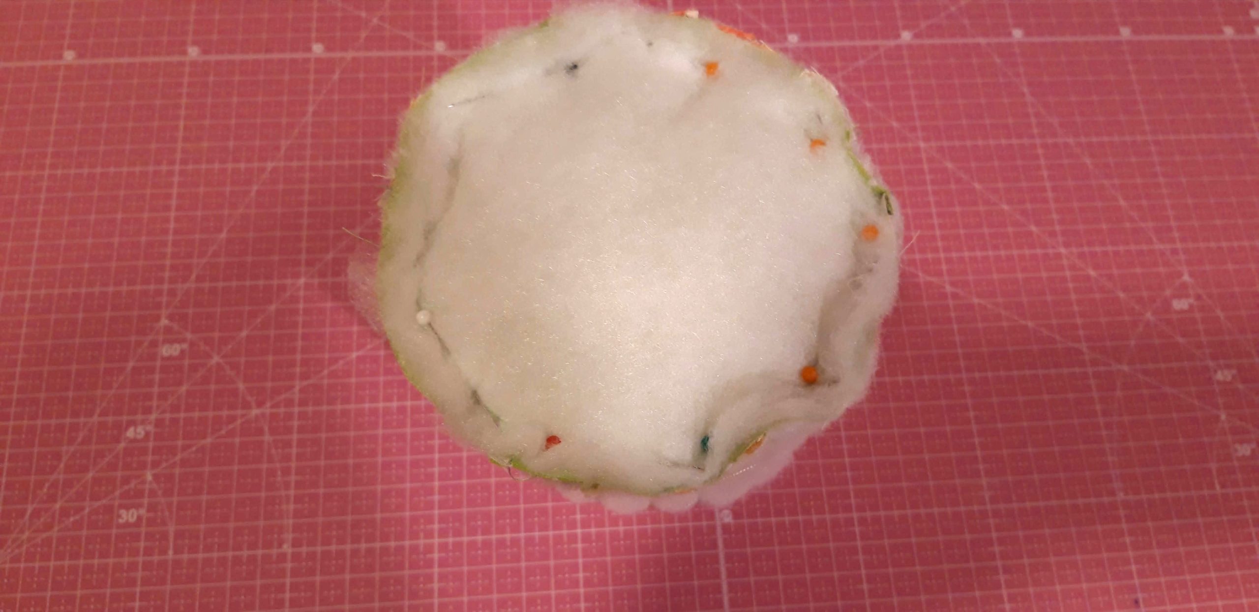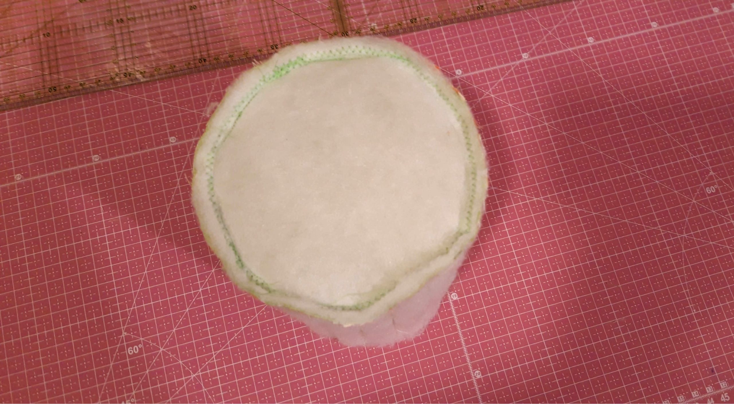 Az egyik kör alakú pamutvászon hátuljára körbe rávarrtam a vatelint, majd ezt gombostűvel rátűztem annak a hengernek az aljára amit a csíkokból varrtam össze. Az összetűzésnél is összevarrtam. Készen volt a külső rész.
