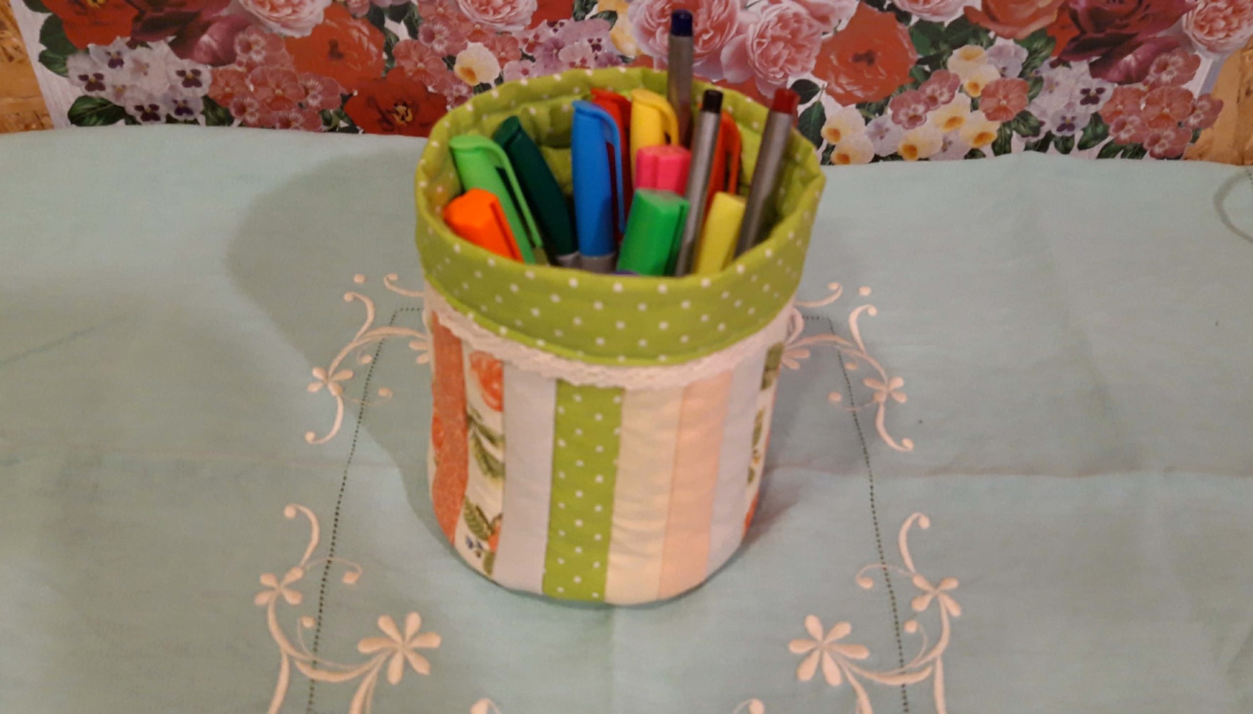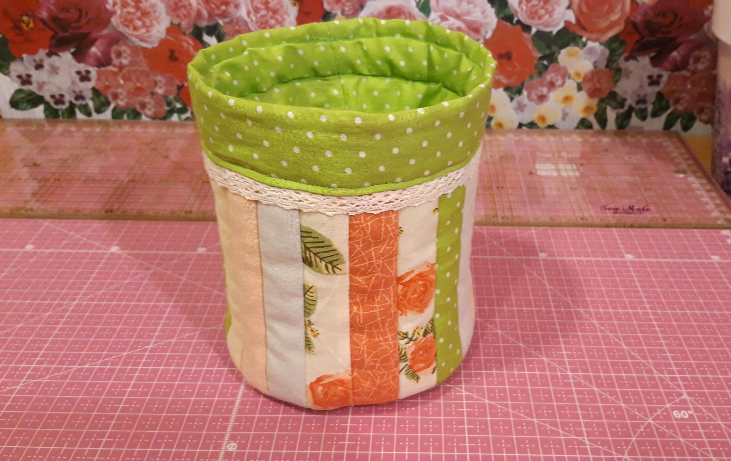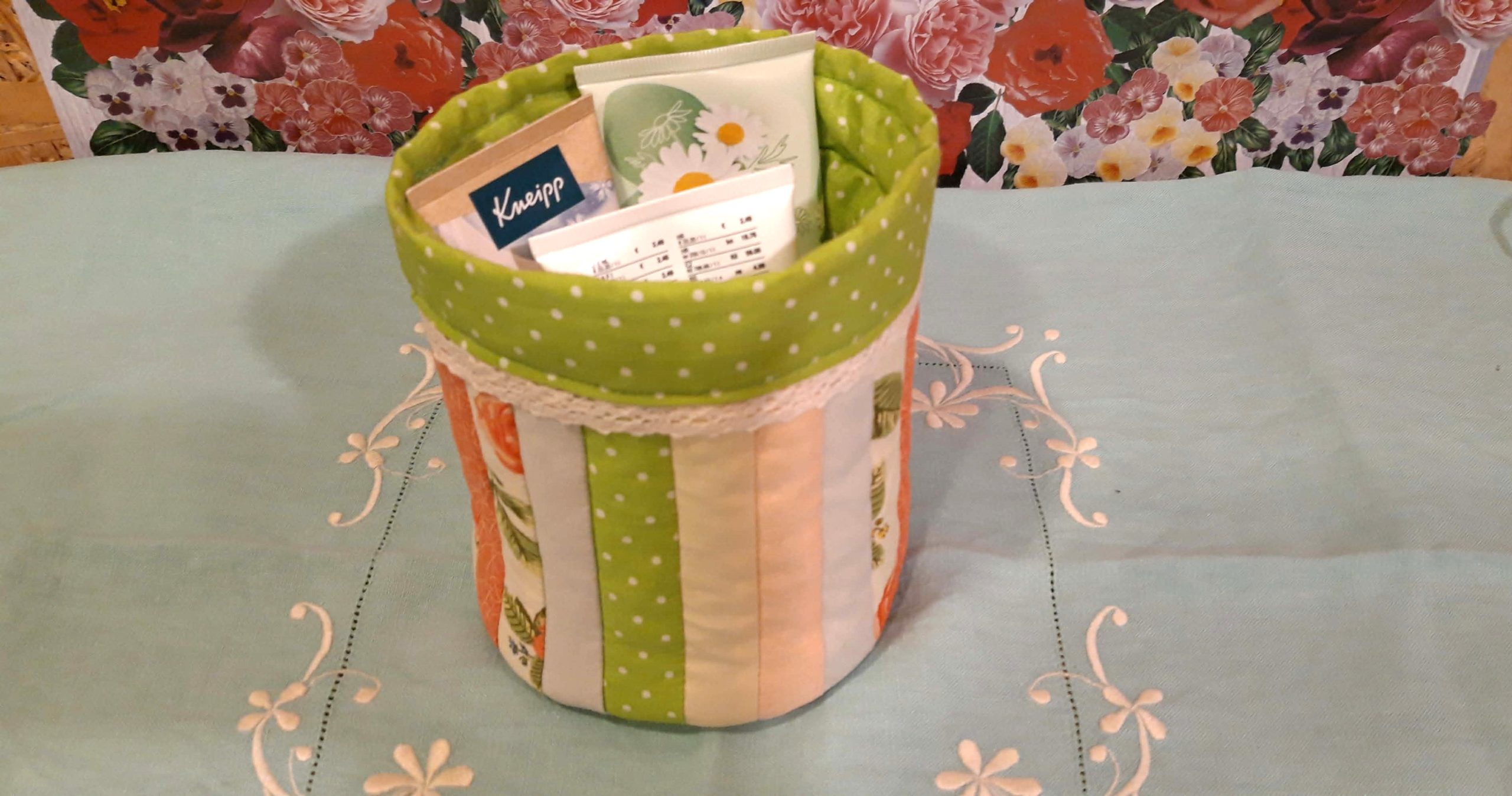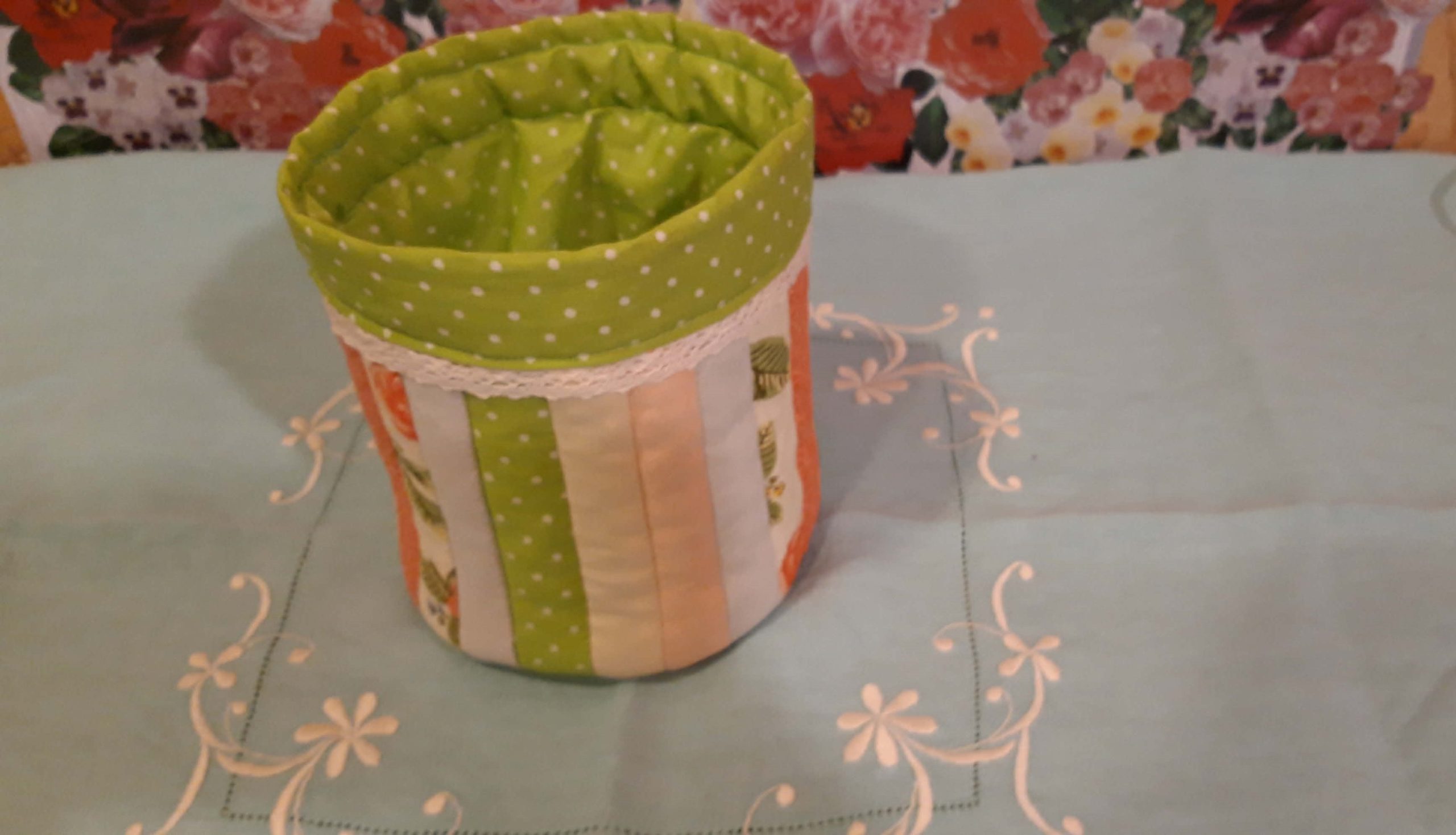 Belebújtattam a vatelinos külső részbe és az alján a külső és belső részt pár helyen összetűztem. Így láttam meddig ér a külső rész a bélésnek. Itt összetűztem őket és körbevarrtam. Majd a bélés fennmaradó magasságát lehajtottam a kosár külsejére, a szélét behajtva (én egy csipkecsíkot is tettem közé) letűztem és levarrtam.
