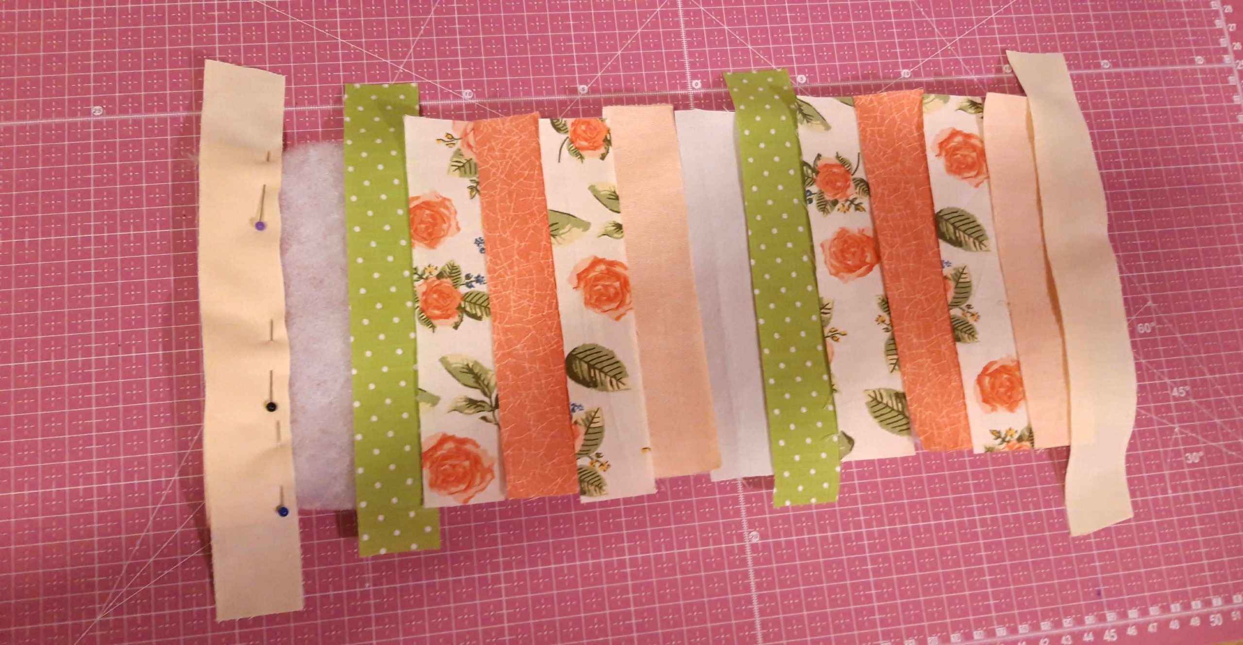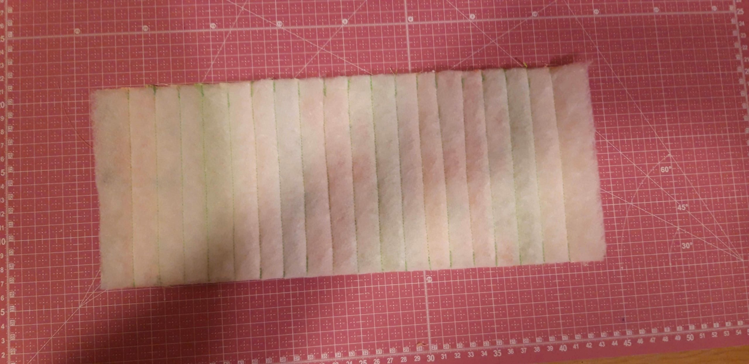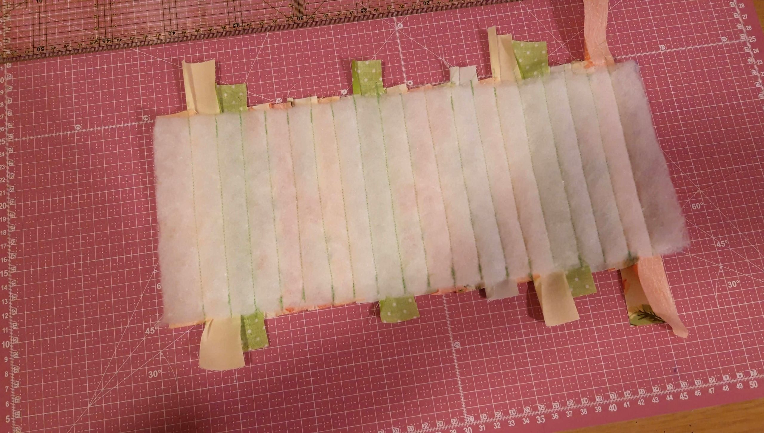 A csíkokat végigfektettem a vatelinre, amilyen sorrendben szeretném varrni. A második csíkot színével ráfordítottam az elsőre és a jobb oldalon a gombostűk mentén rávarrtam a vatelinre. Utána széthajtottam és a második csíkra ugyanígy ráfordítottam a harmadikat és a jobb szélén rávarrtam a vatelinre majd megint visszahajtottam a színére. Ezt folytattam egészen az utolsóig.