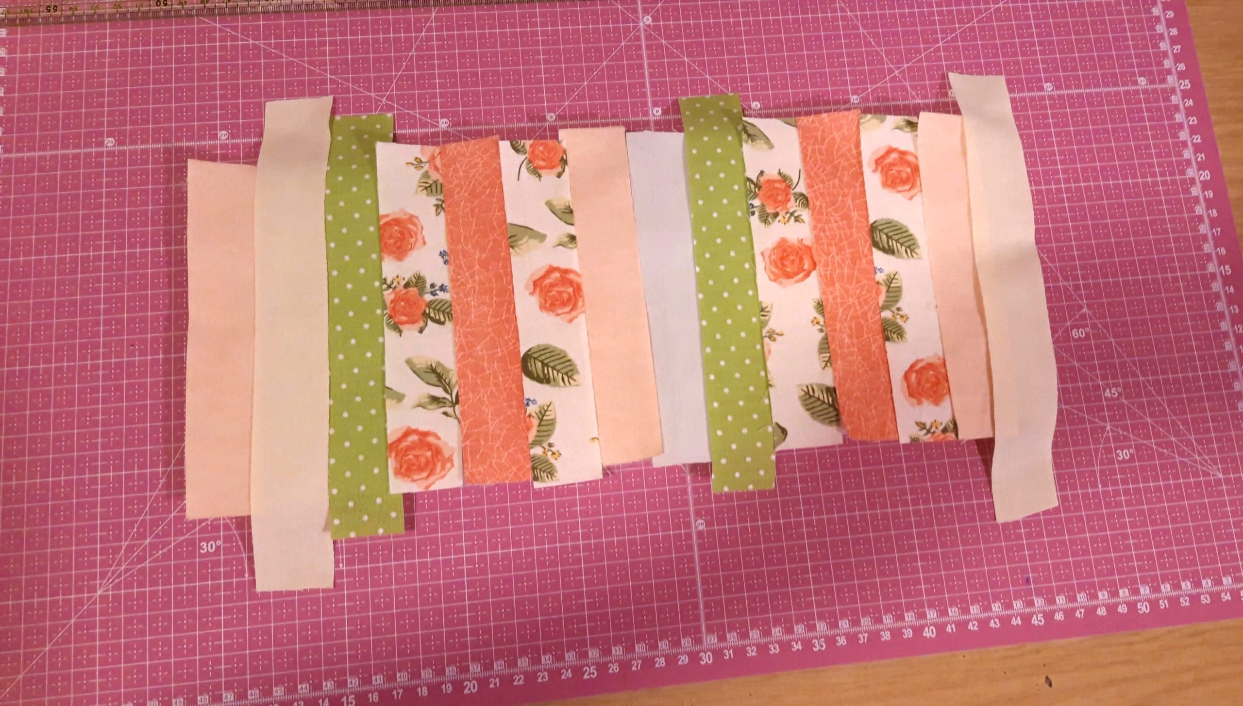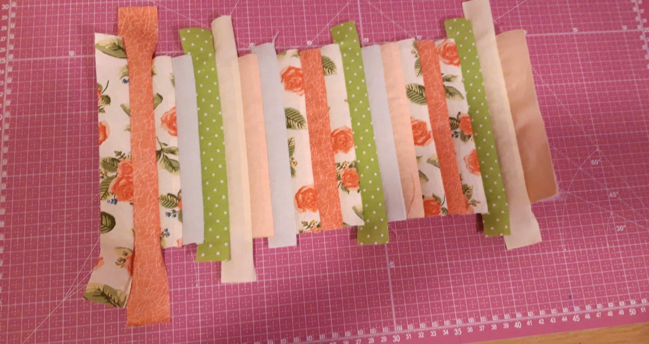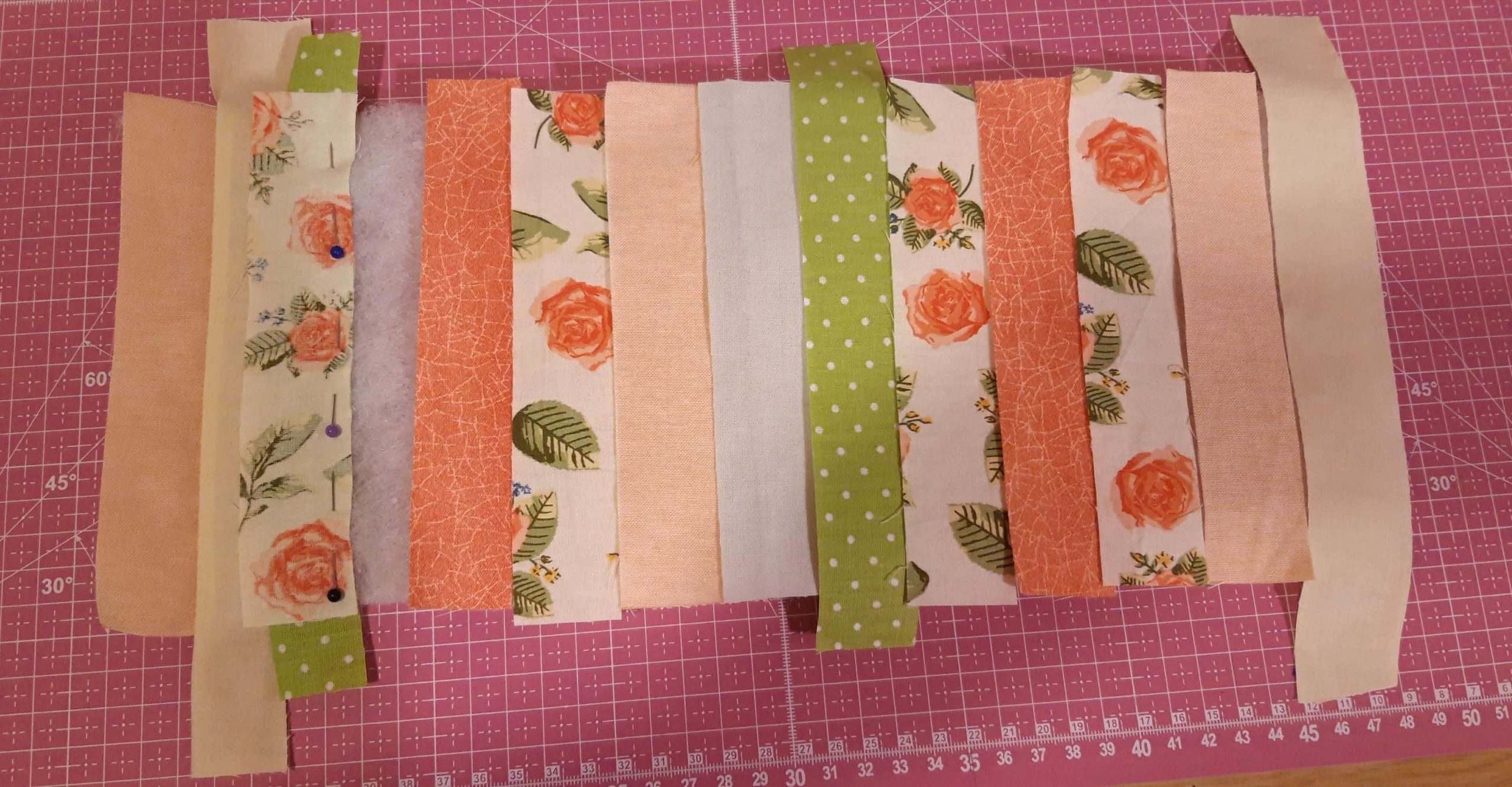 A csíkokat végigfektettem a vatelinre, amilyen sorrendben szeretném varrni. A második csíkot színével ráfordítottam az elsőre és a jobb oldalon a gombostűk mentén rávarrtam a vatelinre. Utána széthajtottam és a második csíkra ugyanígy ráfordítottam a harmadikat és a jobb szélén rávarrtam a vatelinre majd megint visszahajtottam a színére. Ezt folytattam egészen az utolsóig.