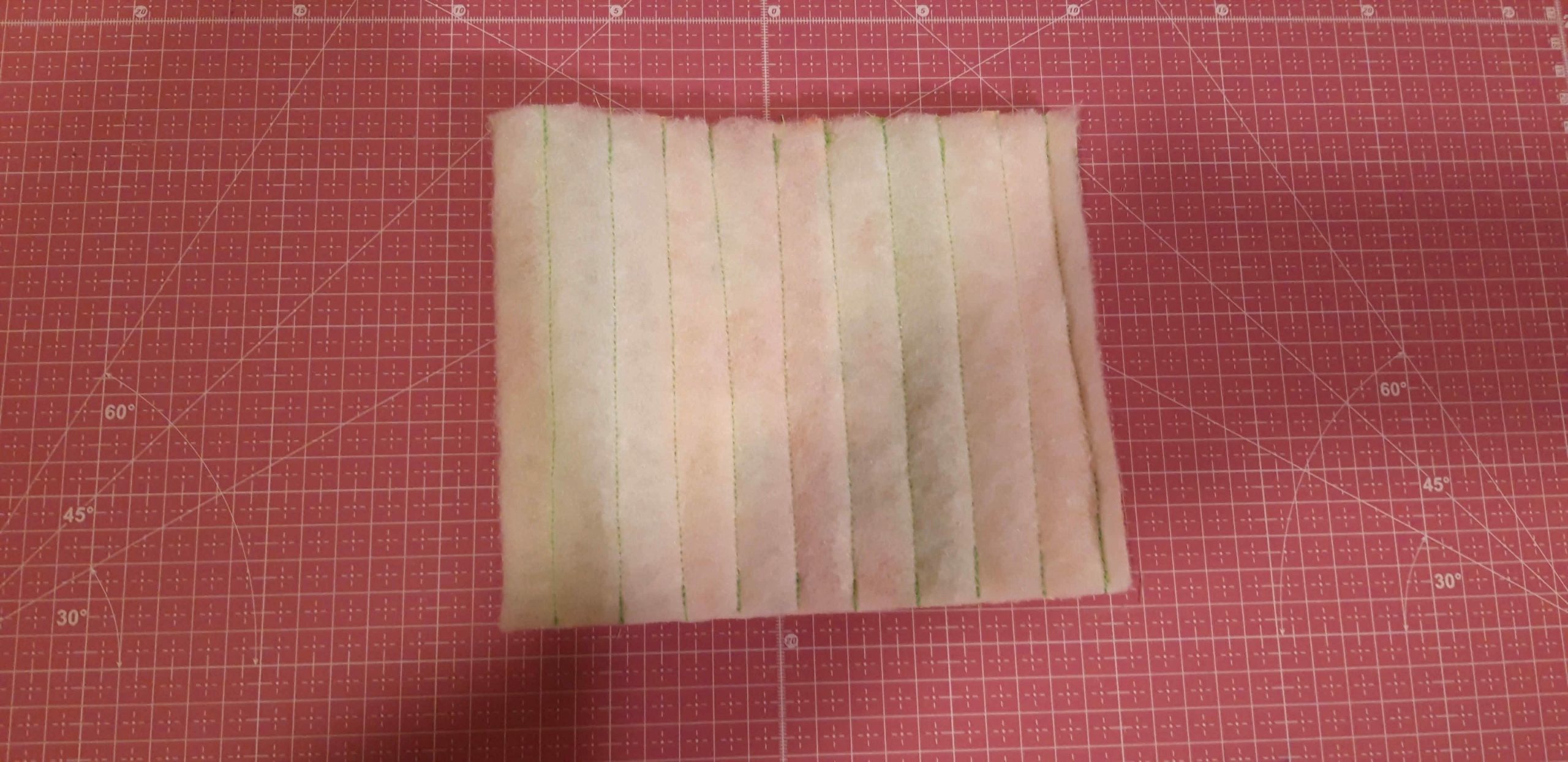 Ezután megfordítottam és az anyagcsíkok hosszát levágtam a vatelin széléig. Majd félbehajtottam színével befelé és összevarrtam az oldalát.
