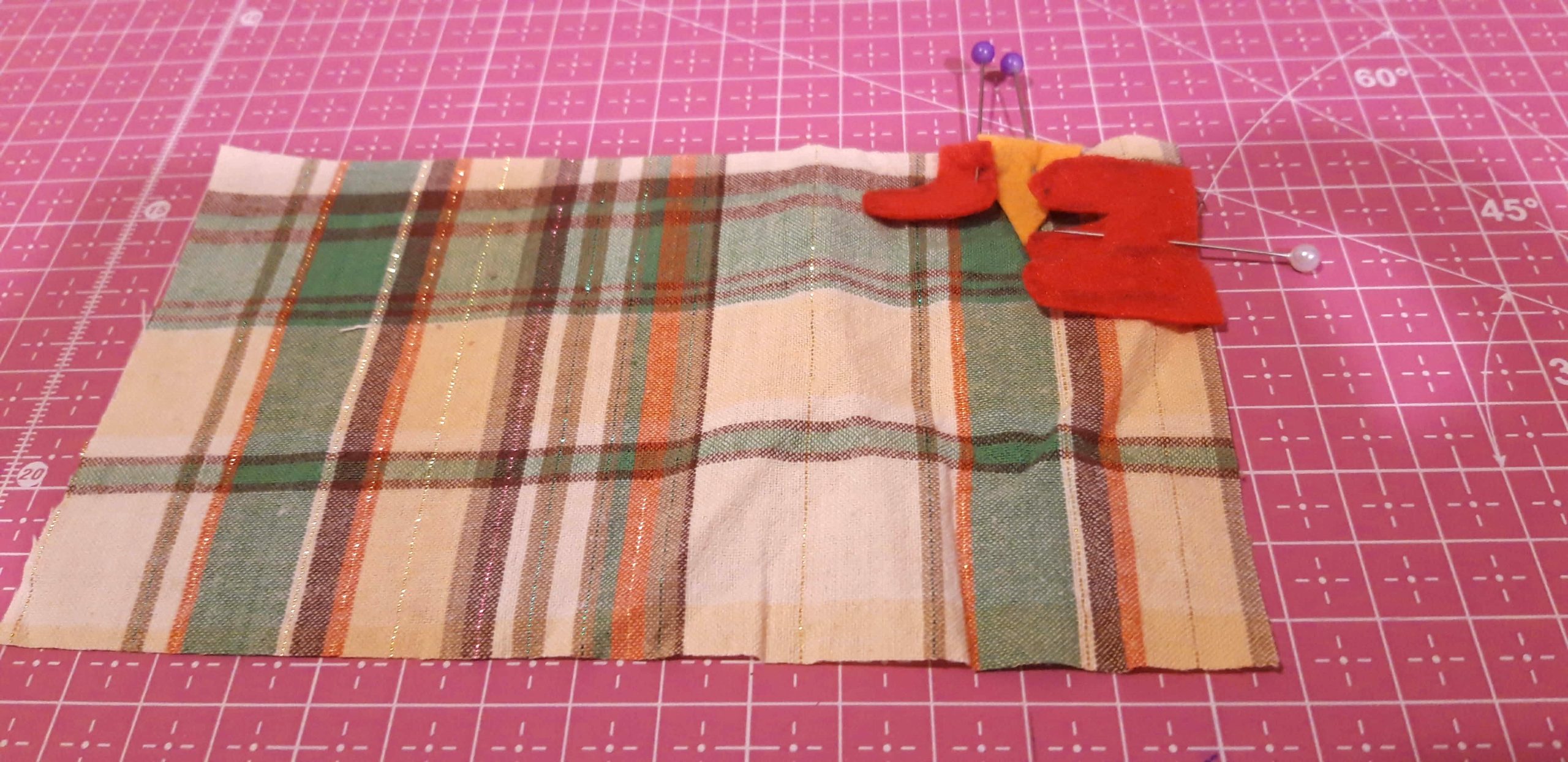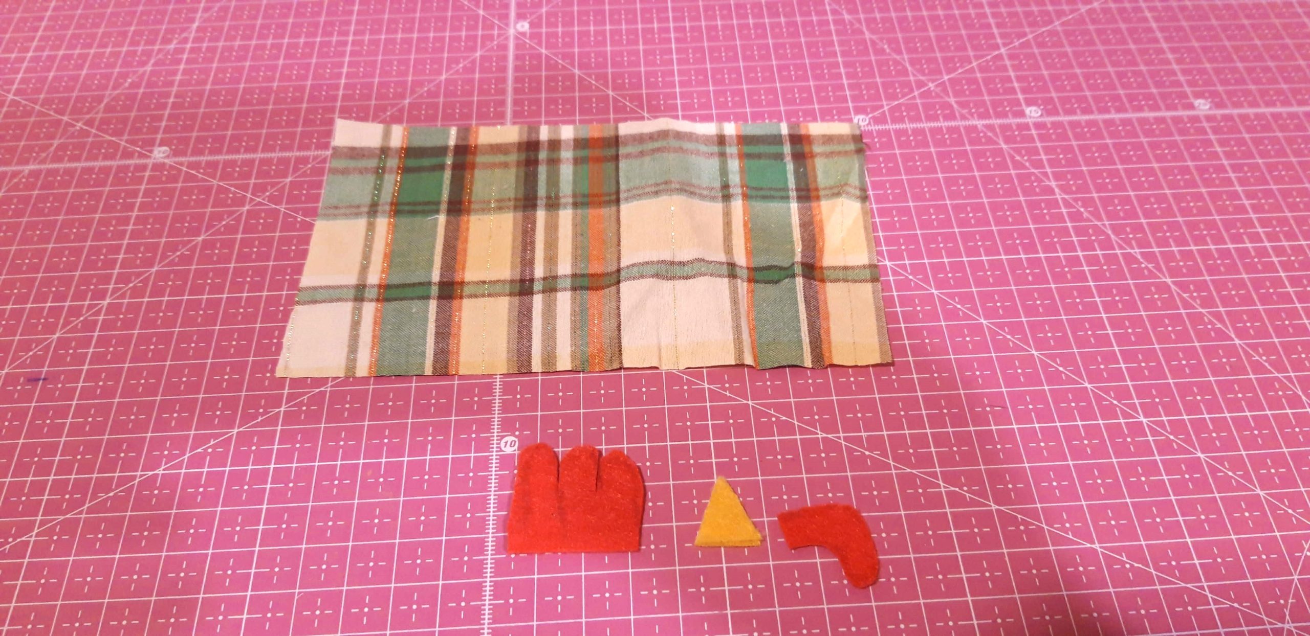 Kiszabtam egy 15x8,5cm-es téglalapot. A tarajt, csőrt és szakállt én filcből vágtam ki.A téglalap hosszabb oldalára a saroktól kb 2 cm-re rátűztem a képen látható módon a csőrt és a szakállt. A vele szomszédos rövid oldalra pedig a tarajt, szintén kb 1,5-2cm-re a saroktól.