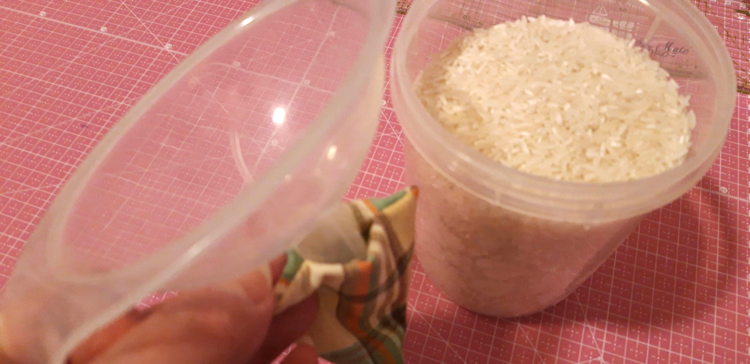 A két szélét bevarrtam, kifordítottam, középen a nyíláson betöltöttem a rizst majd itt is bezártam.
