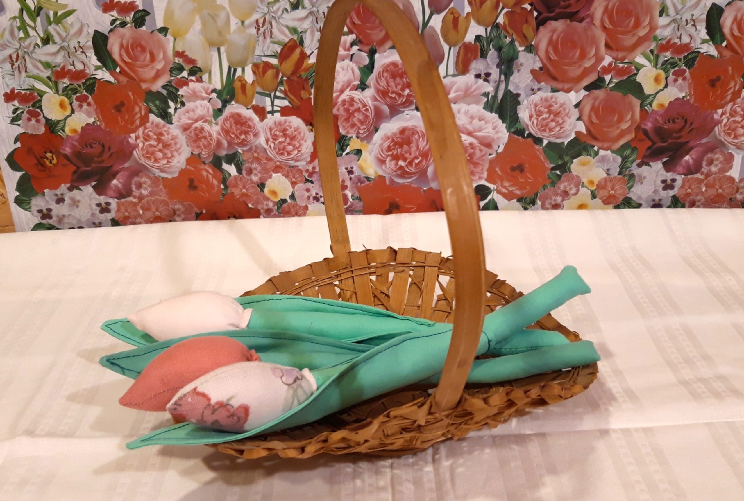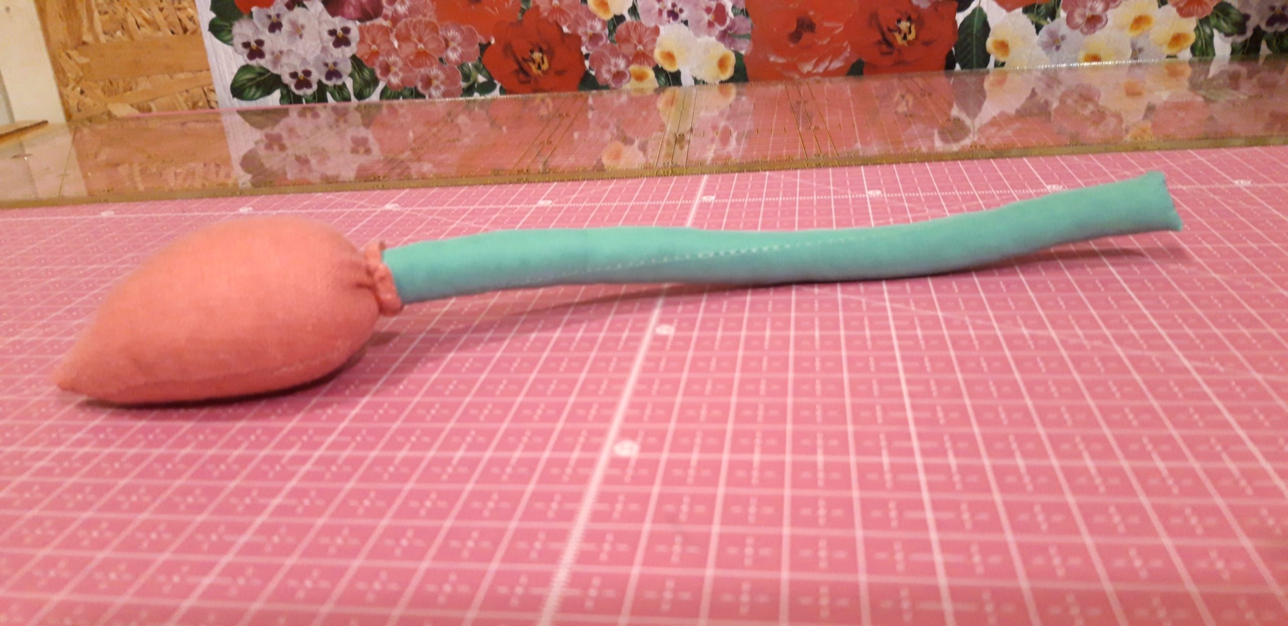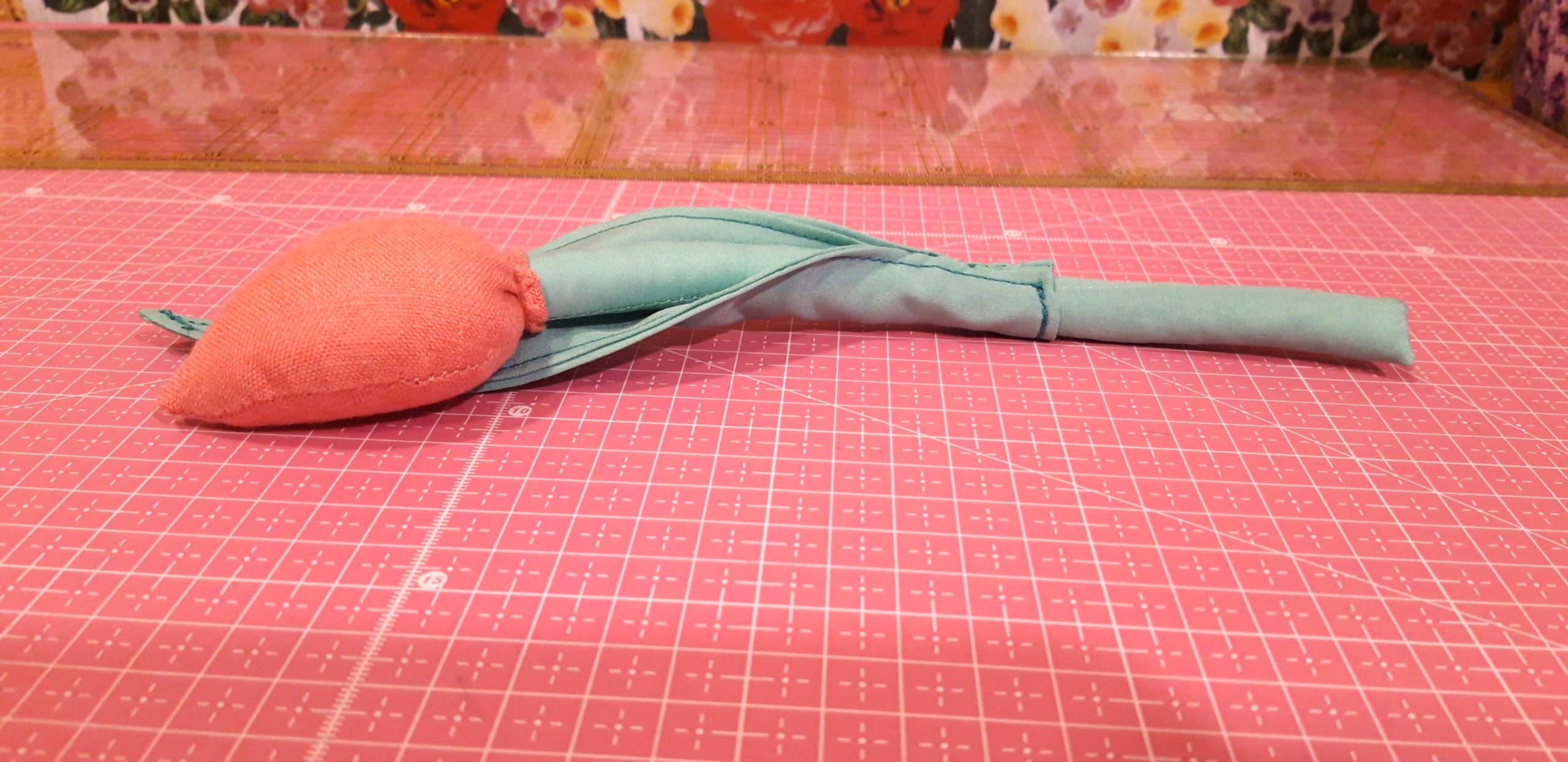 A levél oldalait is összevarrtam az alja kivételével, kifordítottam, a szélét körbevarrtam ami el is maradhat, körbehajtottam és rávarrtam a tulipán szárára. Ezzel kész is lett a tavasz egyik szép virága. 😊
