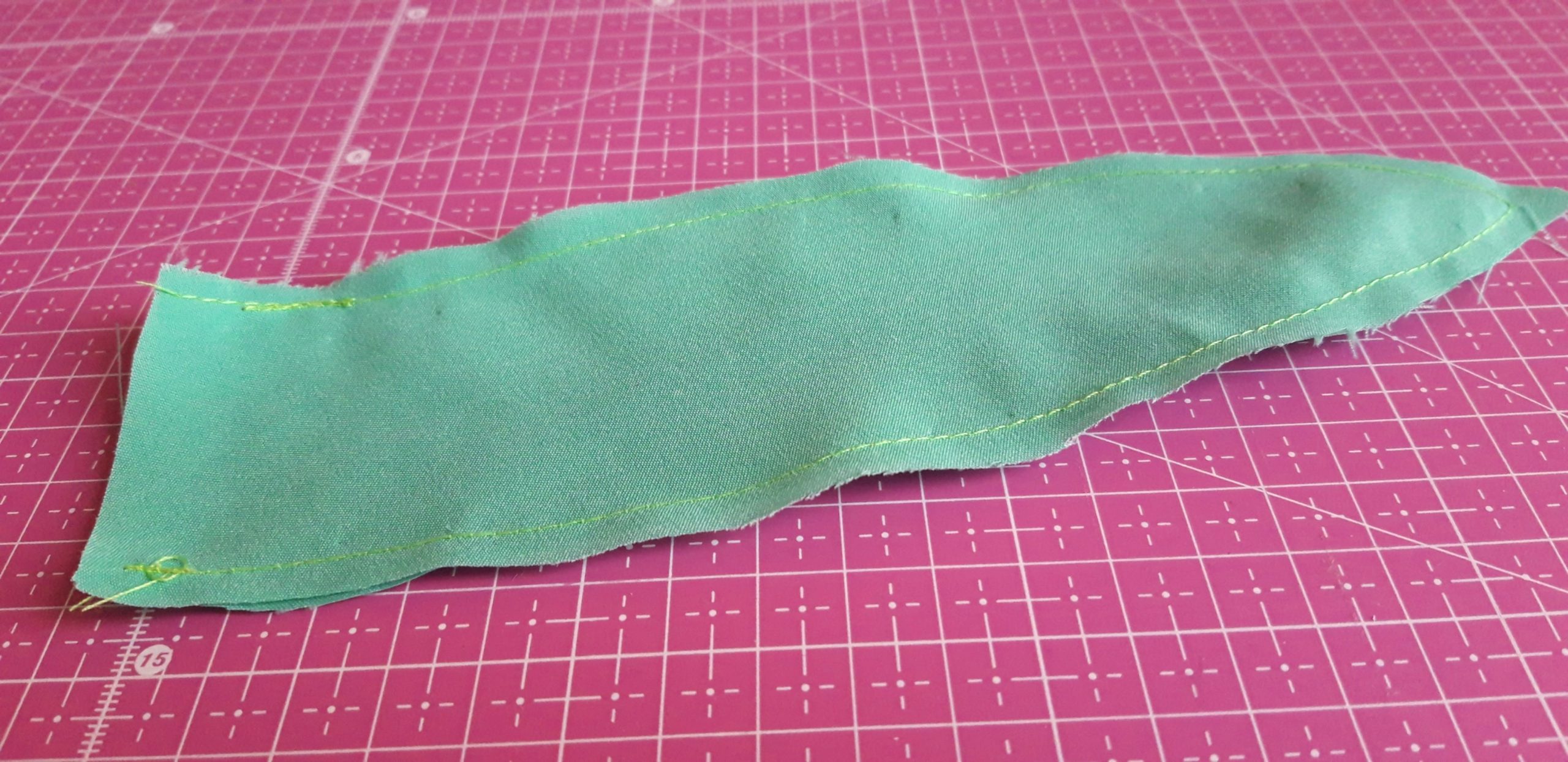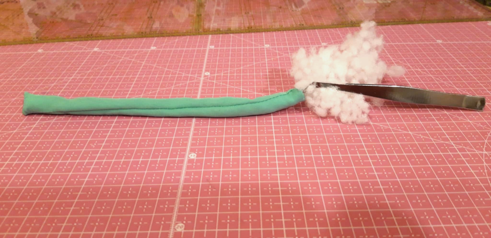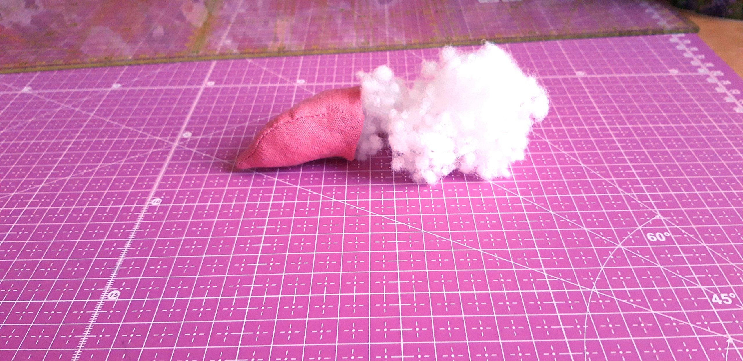 A szárnak kiszabott csíkot hosszába félbehajtottam és az egyik végét meg az oldalát összevarrtam. Kifordítottam, kitömtem, majd a nyitott végét összevarrva beledugtam és bevarrtam a bimbó aljába és belevarrtam.